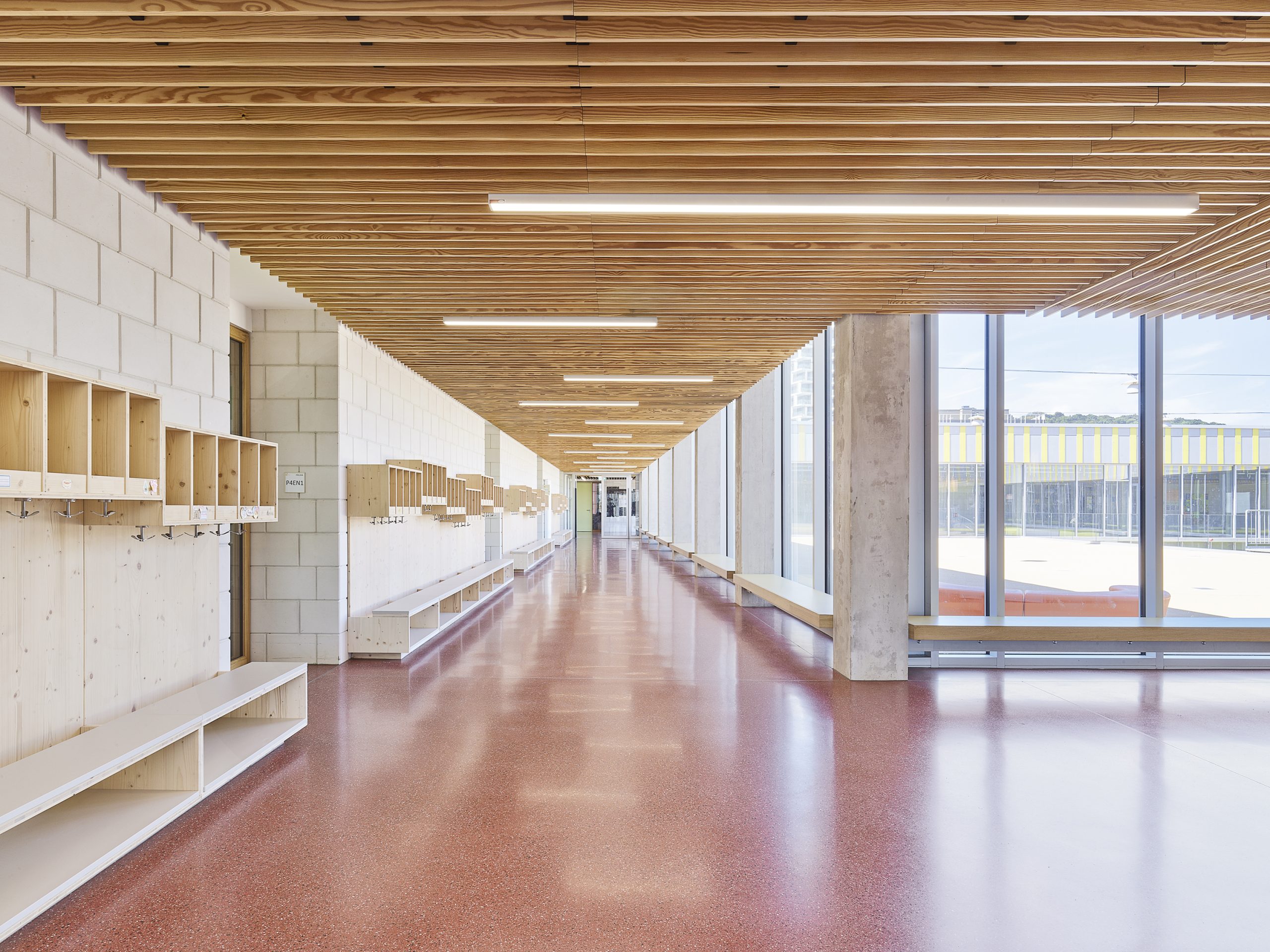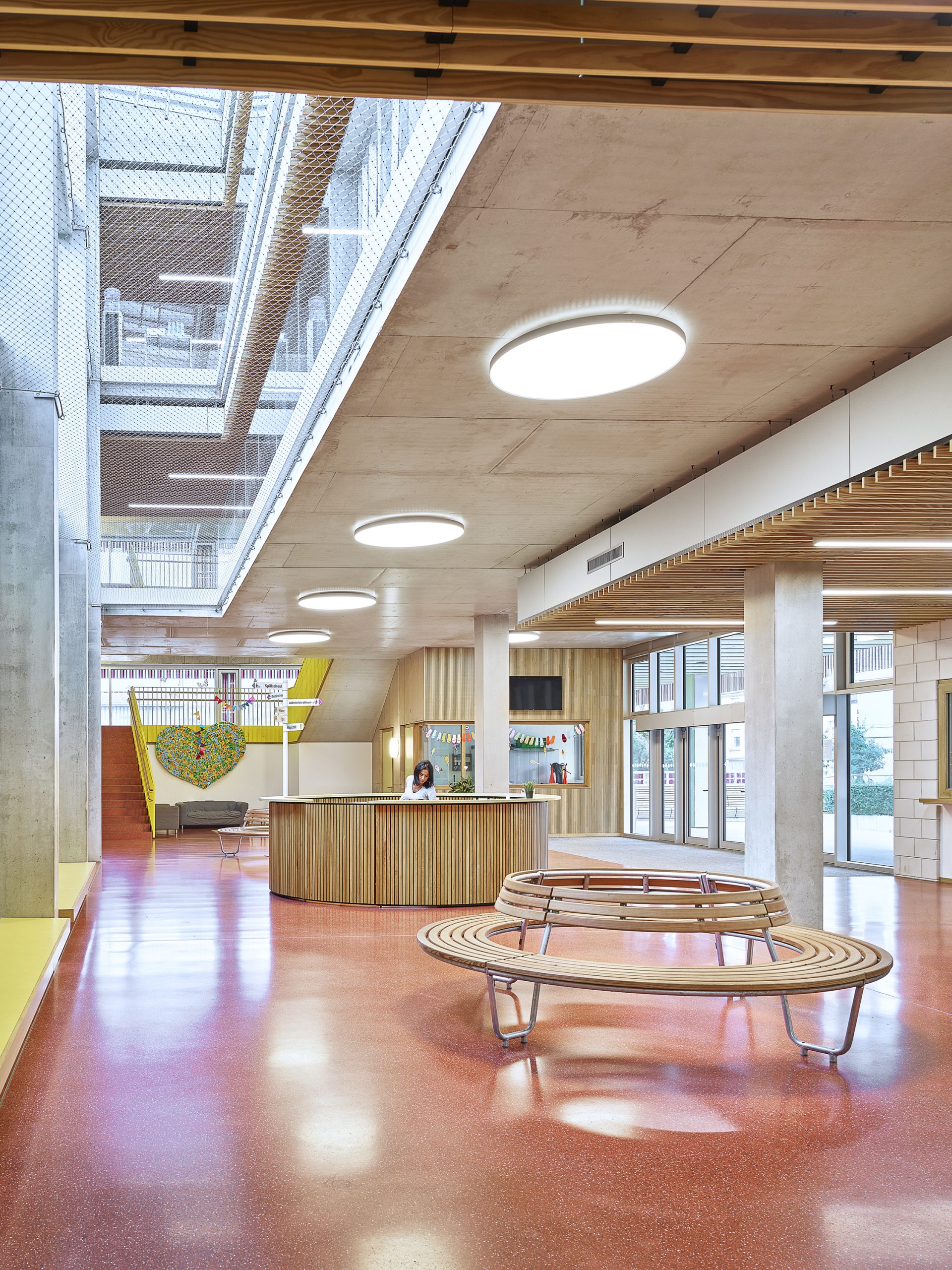 Depuis l’entrée principale, on accède à la « Piazza », lieu d’arrivée, de rencontre et d’identité. Les enfants y sont accueillis et peuvent, depuis la « Piazza », appréhender l’ensemble du bâtiment. Ils peuvent se rendre directement à l’aire de jeux naturelle, au gymnase, à la salle de défoulement, à l’escalier principal ou au secrétariat.